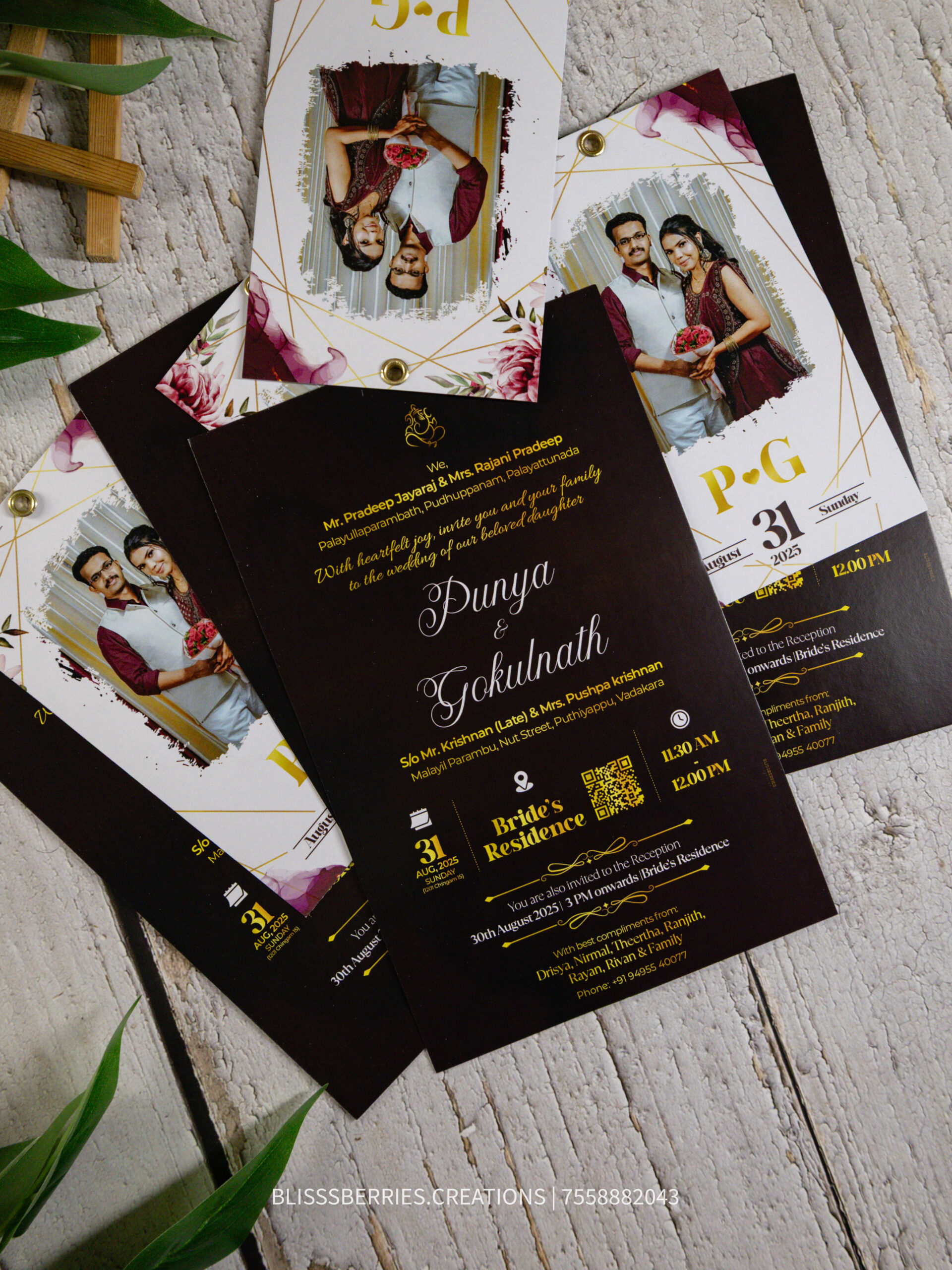 This is a sleek and elegant  2-layer wedding invitation card featuring a durable rivet. This card can be customized with your image. Perfectly combining modern style with sturdy craftsmanship, this layered invitation makes a bold statement for sophisticated weddings.