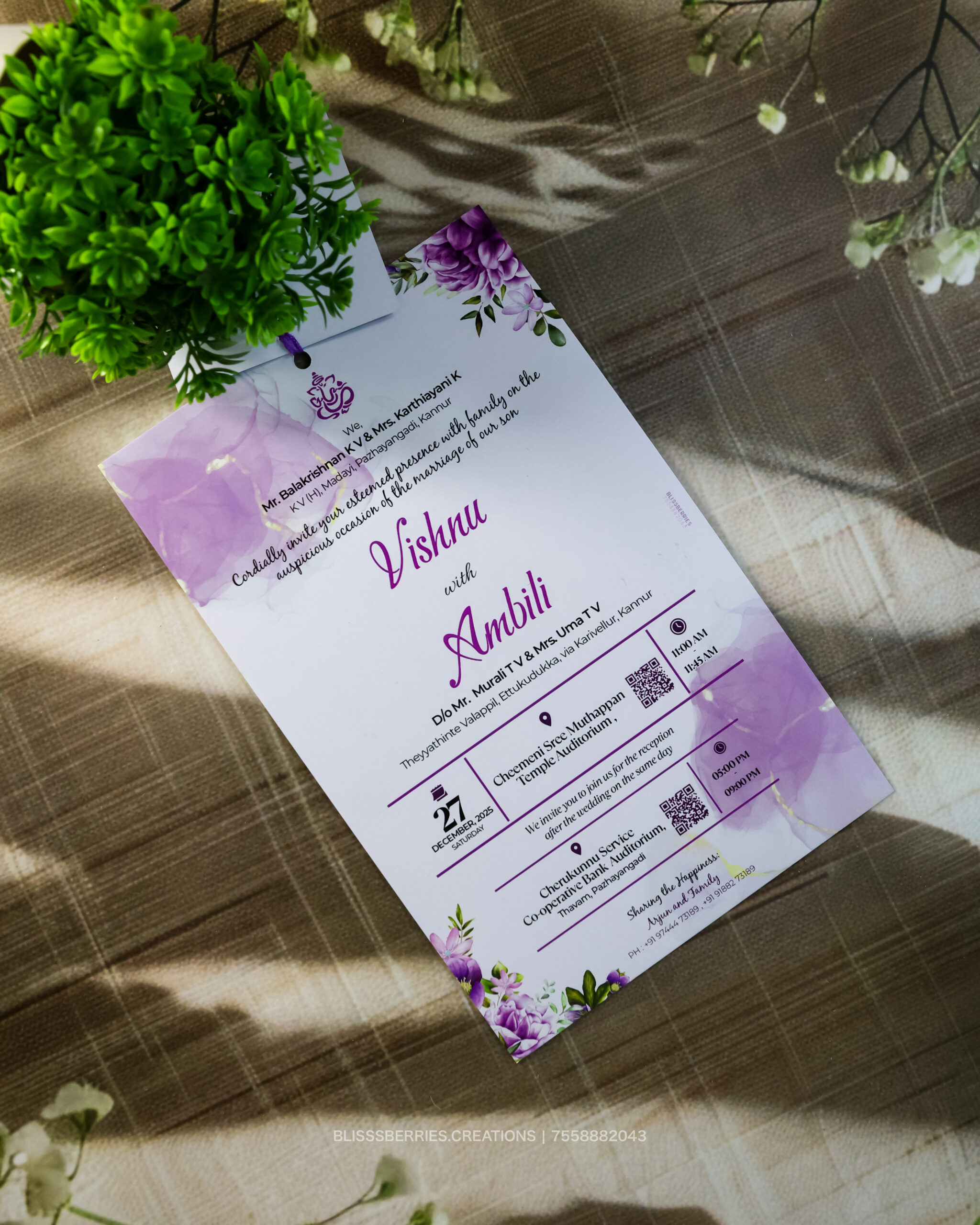 This lavendar blossom card is a refined 2-layer wedding invitation card beautifully adorned with a satin ribbon accent. This premium design combines simplicity with sophistication, perfect for couples wanting a stylish and memorable invite with a delicate ribbon touch.
