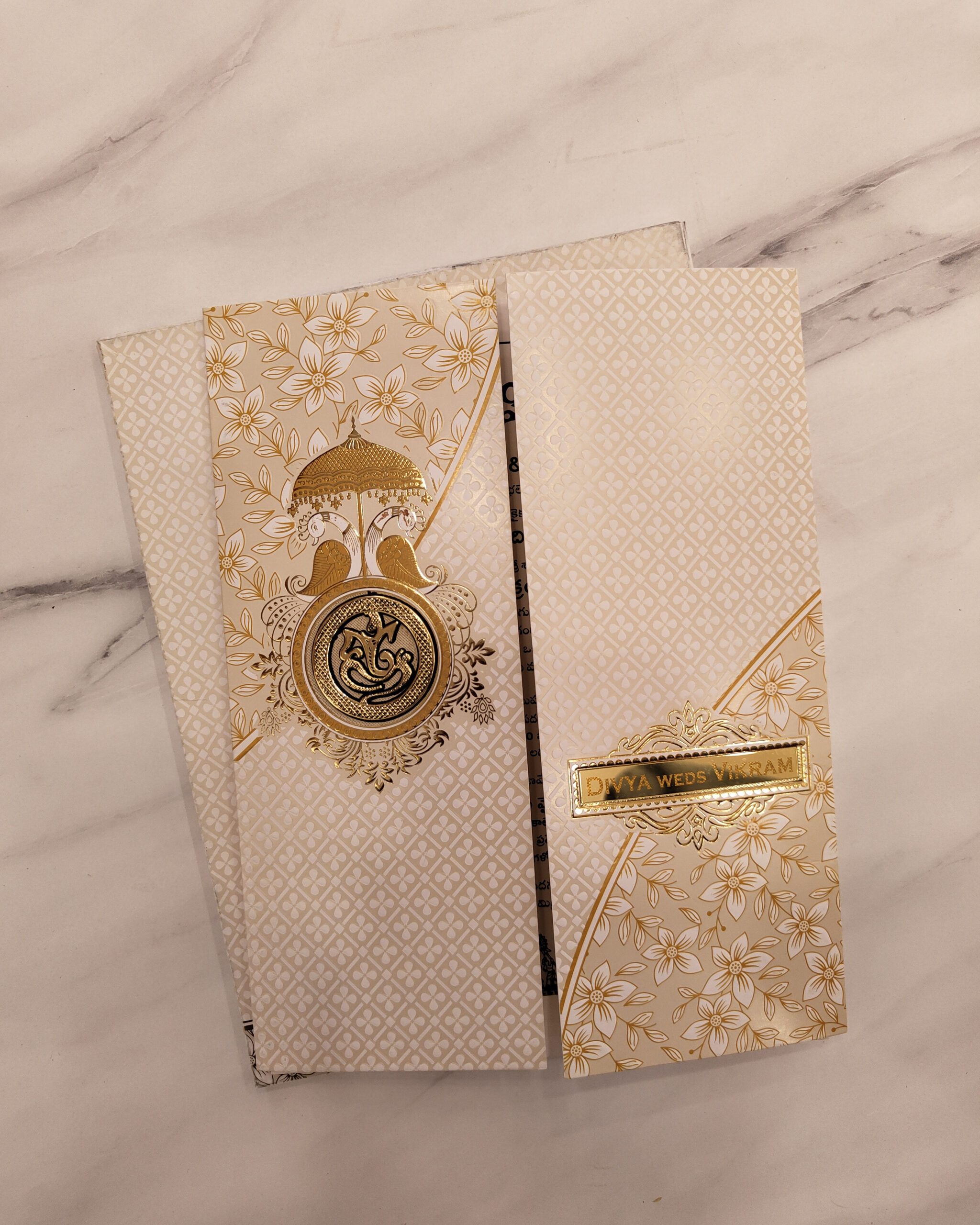 Duo Peacock Gold Floral Wedding Invitation Card with Acrylic Nameplate & Customisable Emblem | Matching Envelope