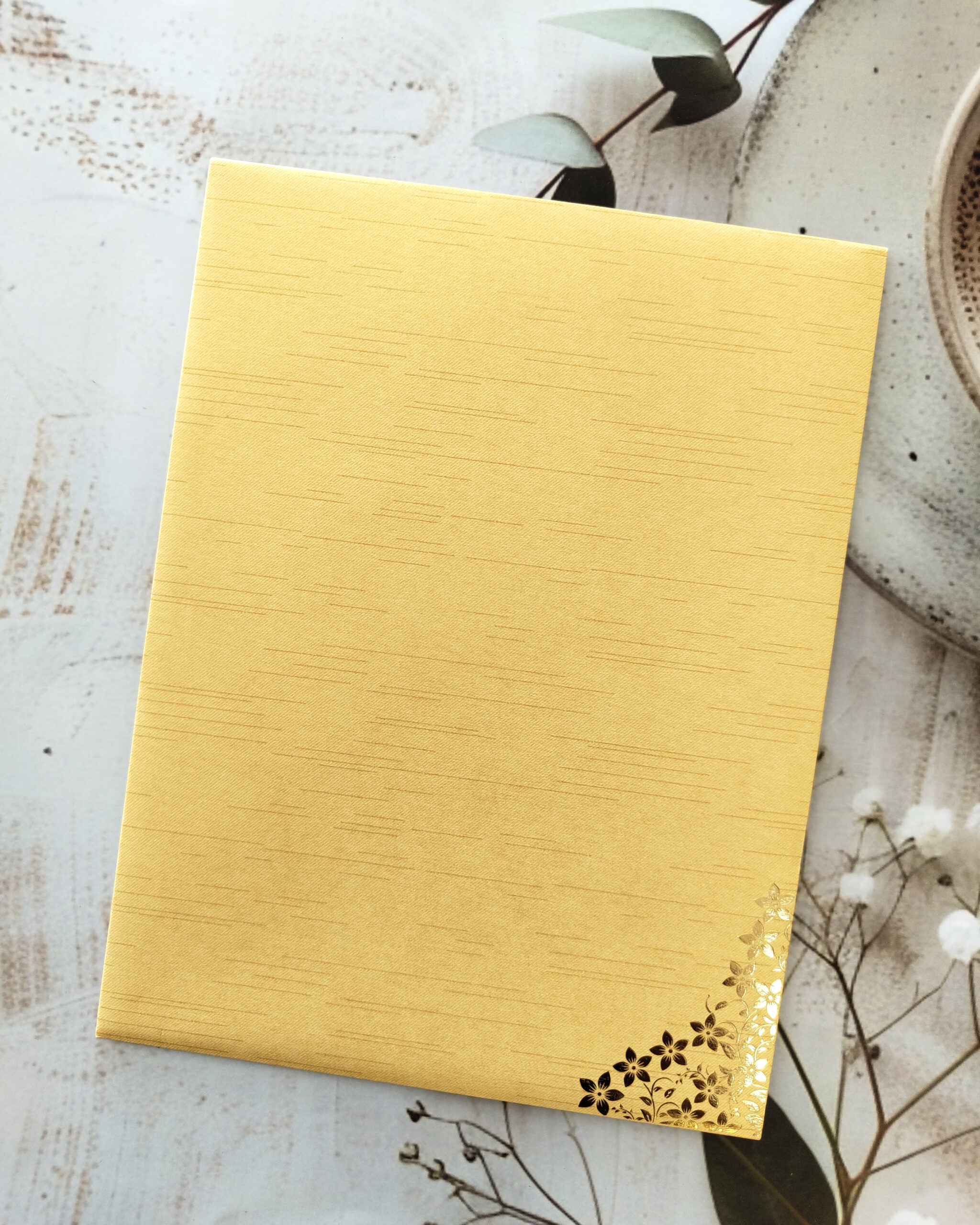 Golden Yellow Gold-Foiled Floral Wedding Invitation Card with Acrylic Nameplate & Matching Envelope – Customizable Emblem