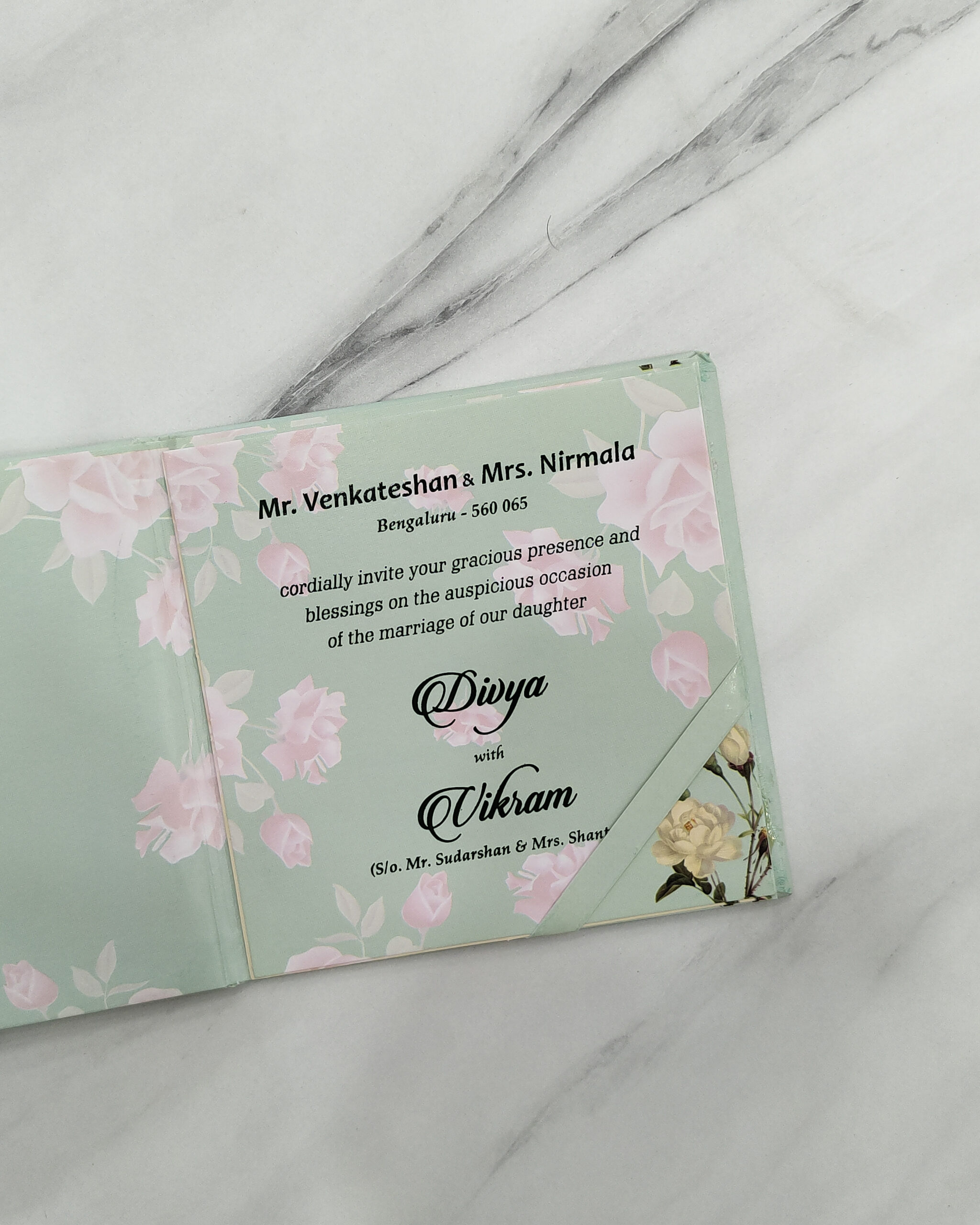 Present your wedding invitation in refined elegance with this Green Floral Square Padded Wedding Card, designed with soft padding and graceful floral detailing. The card features a premium acrylic nameplate that adds a personalised and contemporary touch. Paired with a perfectly matching envelope, this invitation is ideal for couples seeking a sophisticated yet refreshing wedding announcement.