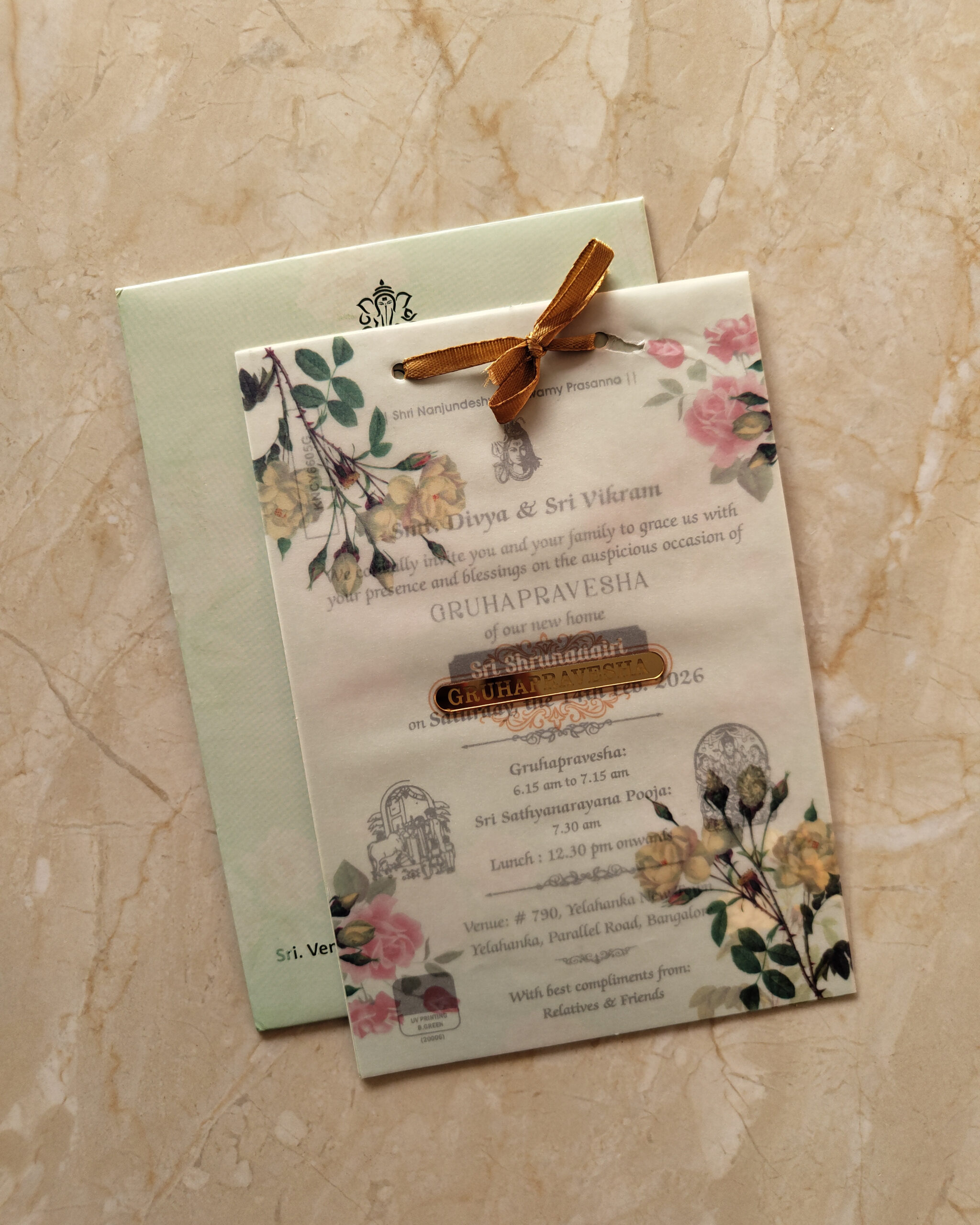 Green Floral Wedding Invitation Card with Acrylic Nameplate & Matching Envelope