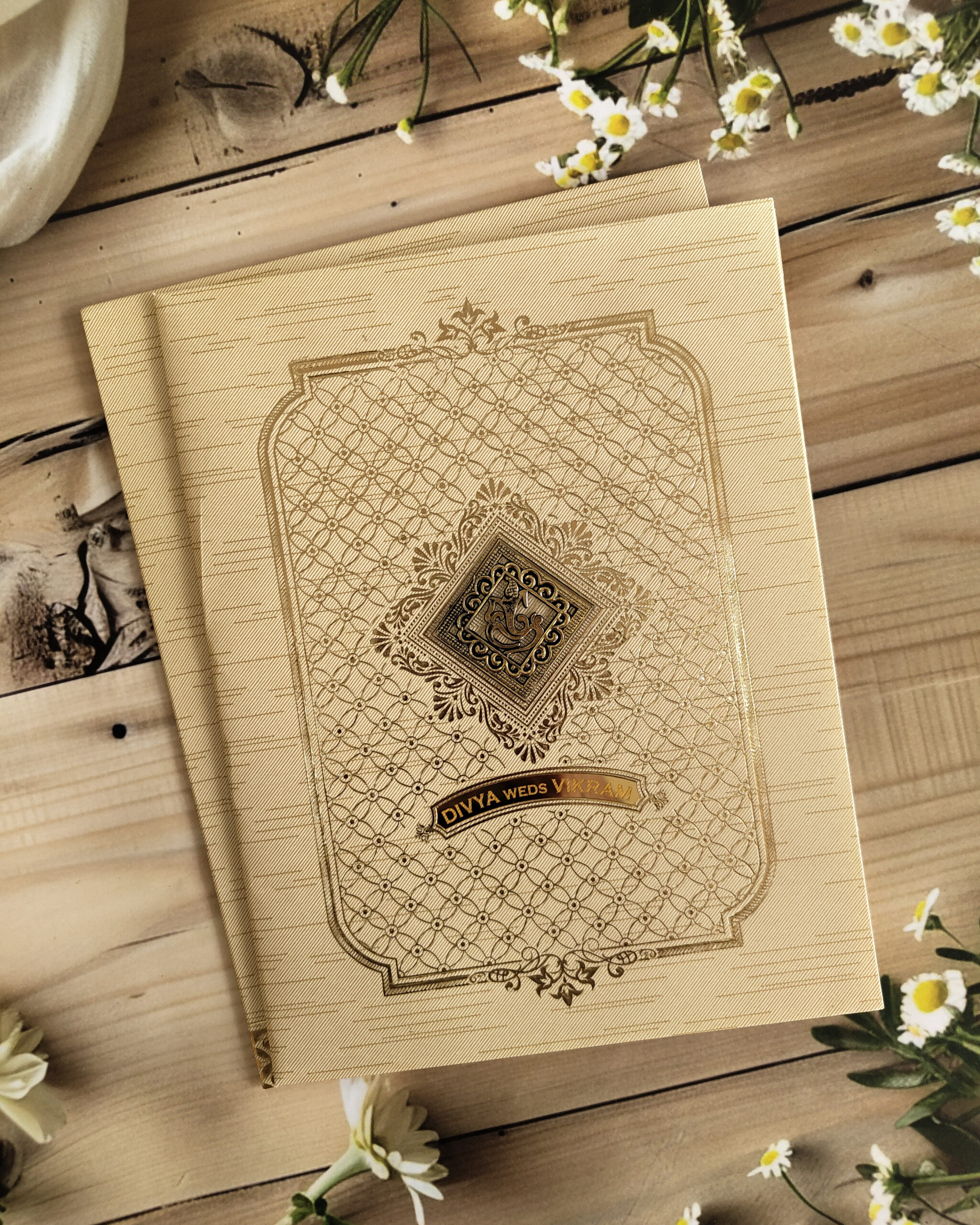 Metallic Beige Embossed Wedding Invitation Card with Acrylic Nameplate, Customisable Emblem & Matching Envelope