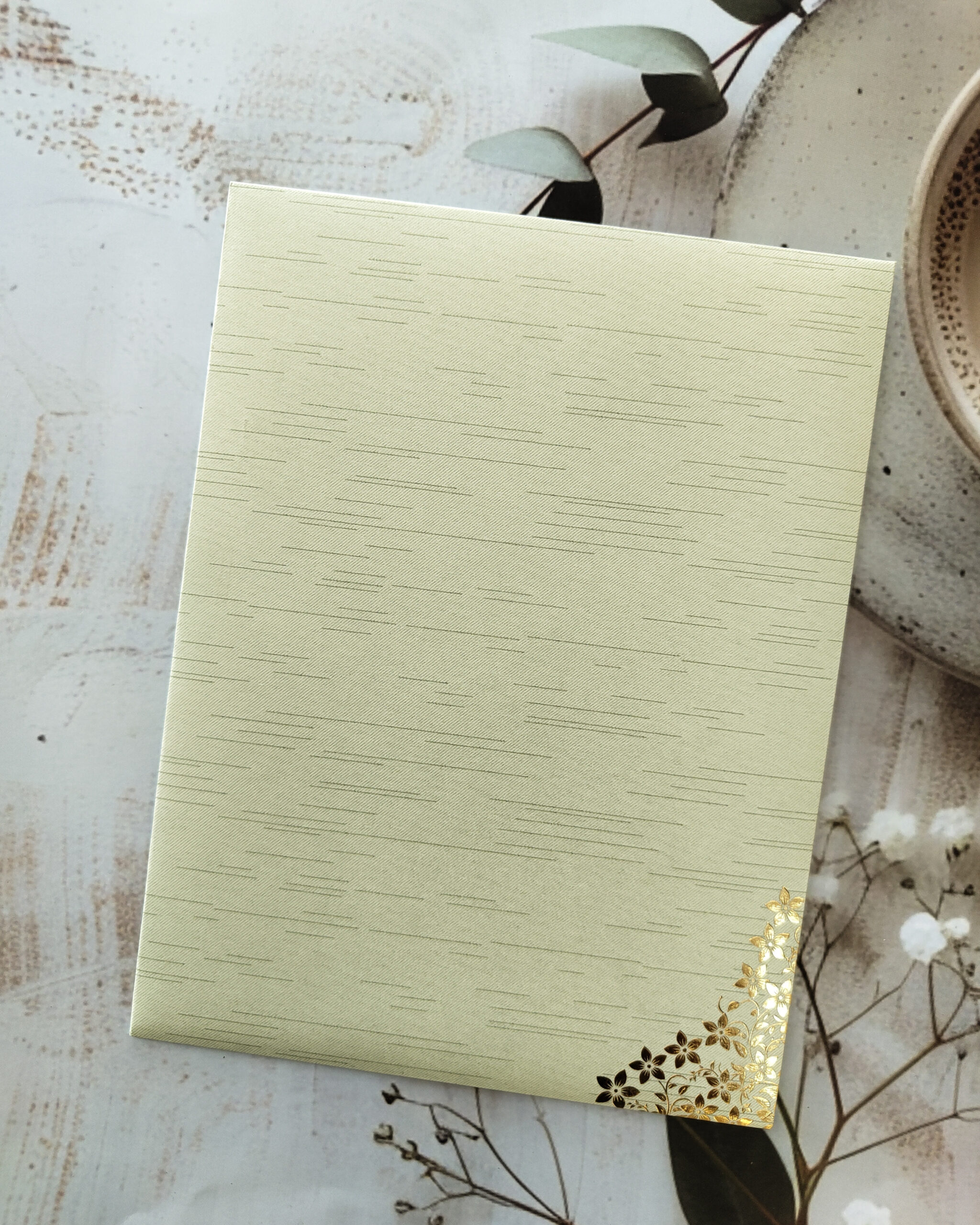 Celebrate your special day with this Premium Cream Gold-Foiled Floral Wedding Card, featuring a sophisticated cream base with luxurious gold foil and intricate floral designs. The card includes a customizable emblem to add a personal touch and comes with a matching envelope for a complete premium invitation set. Perfect for weddings, engagements, and festive ceremonies, this card blends elegance, luxury, and personalization seamlessly.
