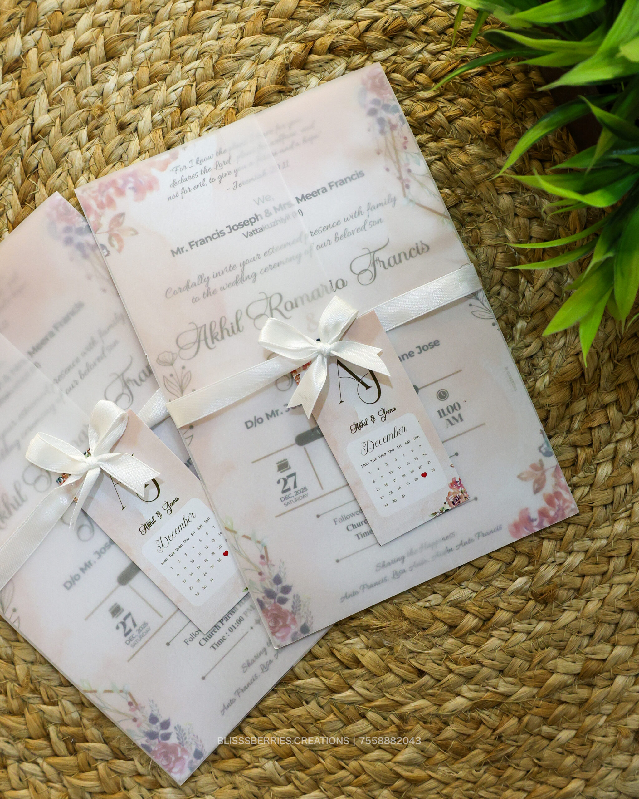 An elegant wedding invitation card featuring a soft pastel floral design, delicately wrapped in a transparent vellum sheet and tied with a satin ribbon and personalized tag. The minimal and romantic look makes it a perfect choice for couples who prefer subtle floral elegance with a modern touch. Customizable in layout, text, and color.