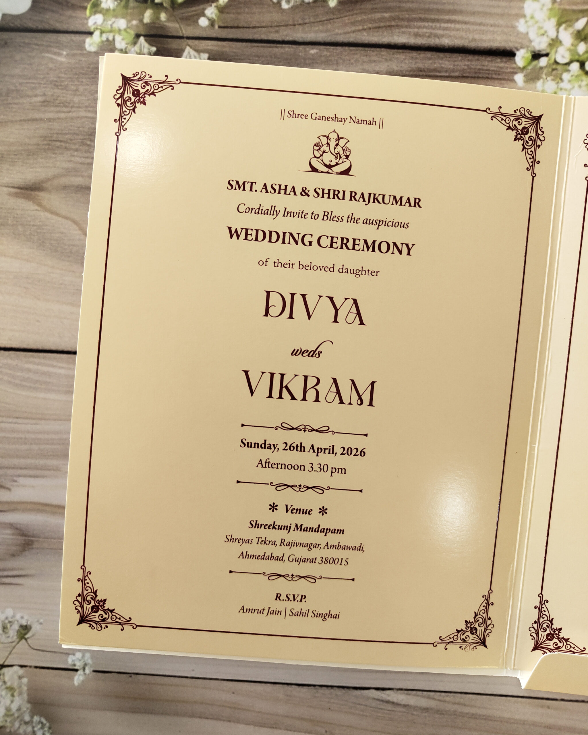 Make your wedding invitation memorable with this Premium Cream Wedding Card, featuring a sophisticated cream design with a luxurious acrylic nameplate. The card includes a customizable emblem and comes with a matching envelope, creating a complete premium invitation set. Perfect for weddings, engagements, and festive ceremonies, this card combines elegance, personalization, and luxury in one exquisite design.