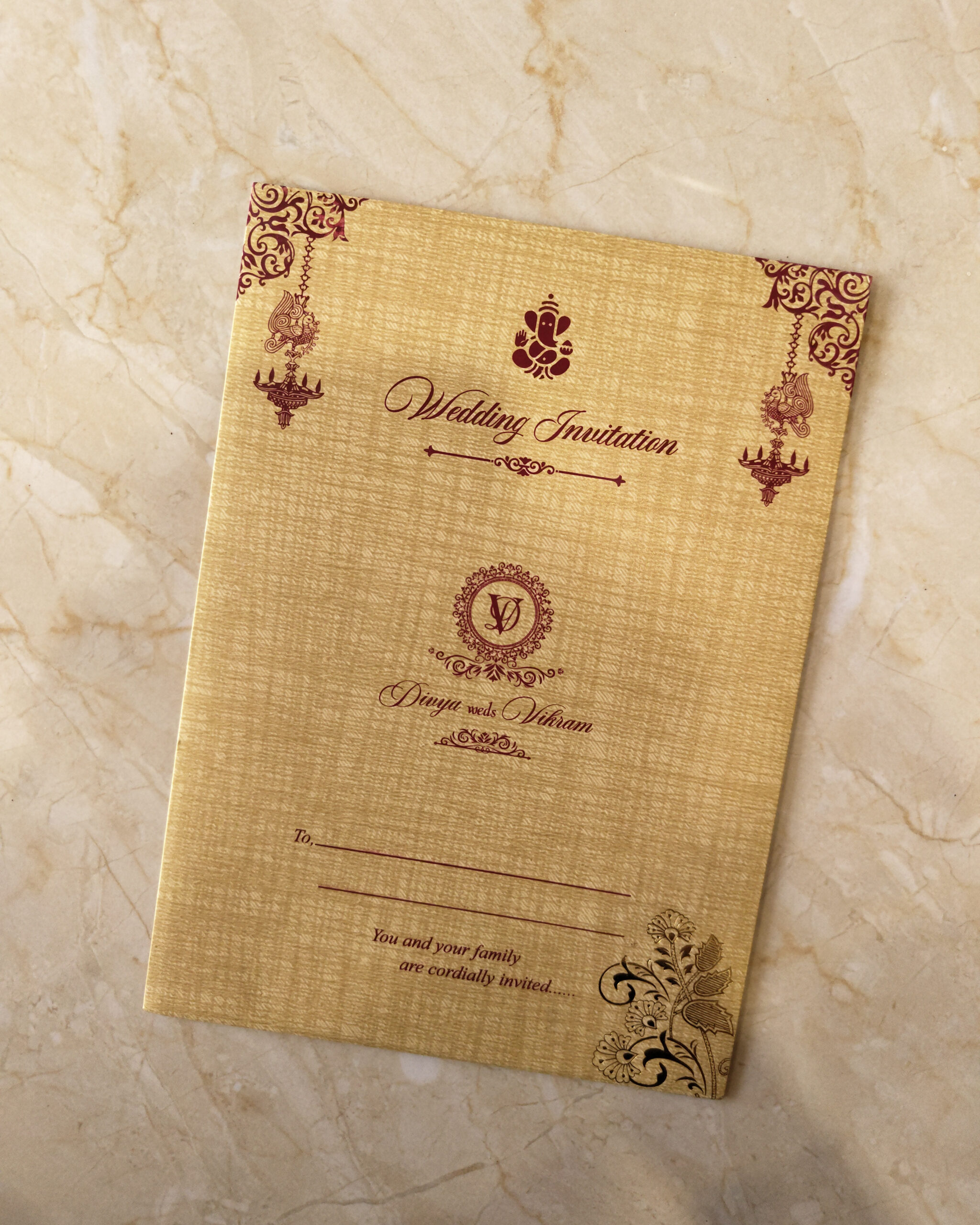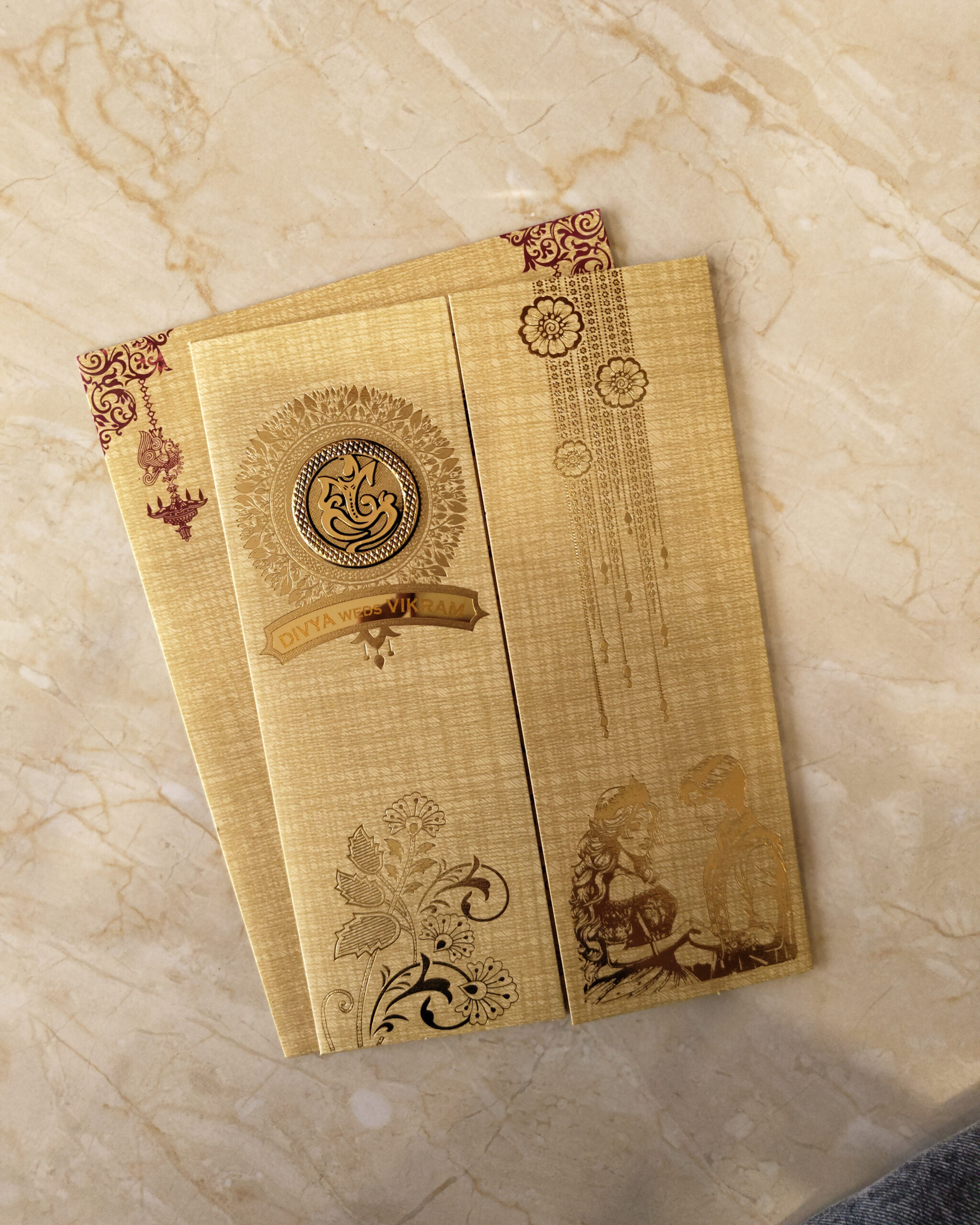 Celebrate your special day with timeless elegance using this Yellow Golden Gold Foiled Cinderella Wedding Card. Accentuated with rich gold foil detailing, an acrylic nameplate, and a customisable emblem, this luxurious invitation is paired with a perfectly matching envelope, making it an exquisite choice for a royal and memorable wedding announcement.